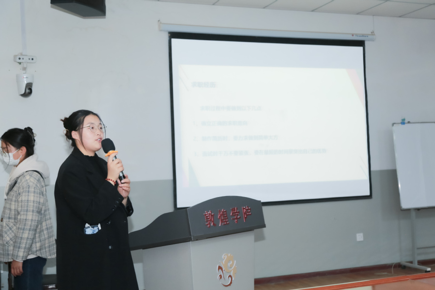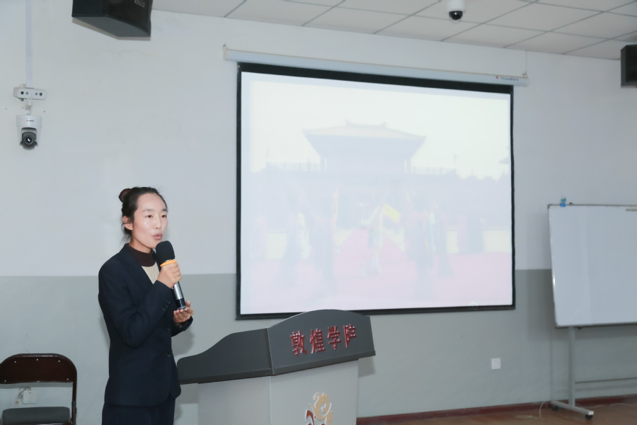 2020 届旅游管理专业毕业生代表、现敦煌市阳关景区接待部讲解员史亮霞分享了个人工作经历。